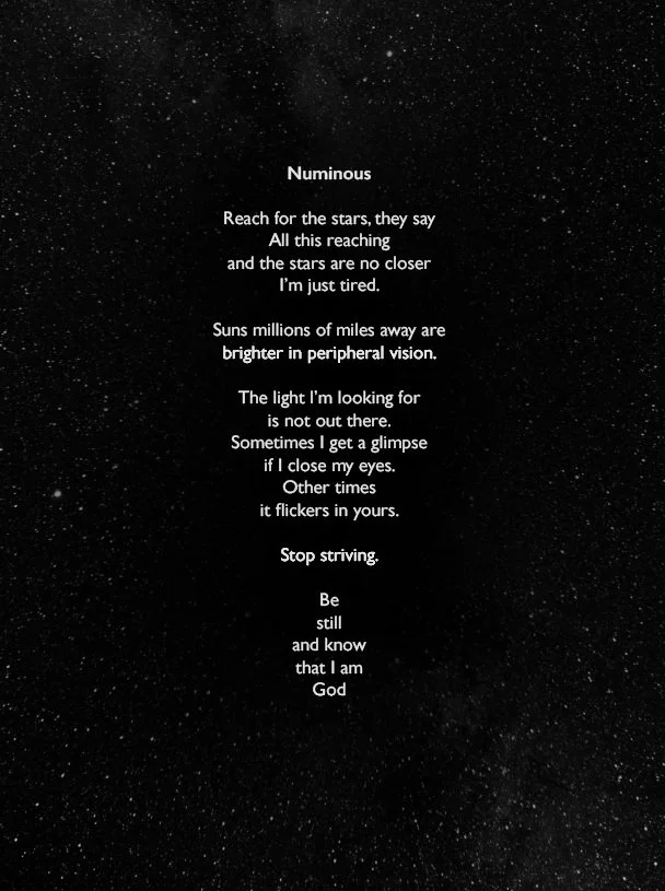 Artist’s Statement: When I experiment with words and images, the process involves an interplay of knowing and not-knowing, of light and dark, and I experience both as necessary to the cycles of nature, the Spirit, and creativity.